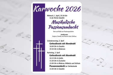 Zur Karwoche 2026 lädt die Kirchgemeinde herzlich zu einer Reihe besonderer Veranstaltungen ein. Den Auftakt bildet am Mittwoch, 1. April, eine musikalische Passionsandacht in der Kirche Glaubitz mit Texten und Musik zum Passionsgeschehen.